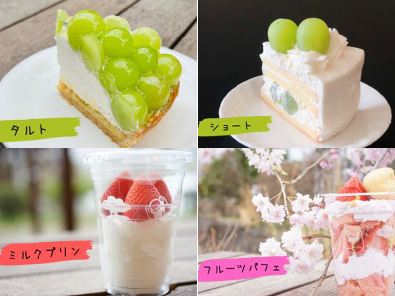 もぎたて果物をたっぷり使って作る、見た目も楽しいモギトーレならではのケーキたち。旬の果物で作っているから、何が食べられるかは、その日のお楽しみ♪(道の駅たくみの里 豊楽館でも販売中) -